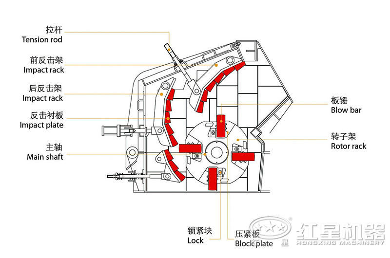 破碎的力來自兩方面,一方面是物料間的互相碰擊產(chǎn)生的作用力。另一方面,物料受到板錘的打擊、與反擊板的沖擊產(chǎn)生的力,這些力共同作用物料,使物料不斷產(chǎn)生裂縫,松散而致粉碎。當(dāng)物料粒度小于反擊板與板錘之間的縫隙時,就被卸出。調(diào)整反擊架與轉(zhuǎn)子之間的間隙可達(dá)到改變物料出料粒度和物料形狀的目的。