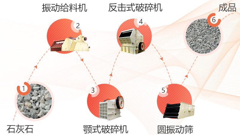 物料由GZD-1500×5600振動(dòng)給料機(jī)均勻、定量、連續(xù)地輸送進(jìn)PE-1200×1500鄂式破碎機(jī),進(jìn)行粗碎,粗碎后的石料由輸送機(jī)送到PF-1520反擊式破碎機(jī)進(jìn)行細(xì)碎;破碎后的物料由輸送機(jī)送進(jìn)振動(dòng)篩進(jìn)行篩分,符合粒度要求的石料由成品輸送機(jī)送往成品料堆;不符合粒度要求的物料由輸送機(jī)返料送到PF-1520反擊式破碎機(jī)再次破碎,形成閉路多次循環(huán)。生產(chǎn)過(guò)程中,各級(jí)設(shè)備配備合理,提高了生產(chǎn)效率。