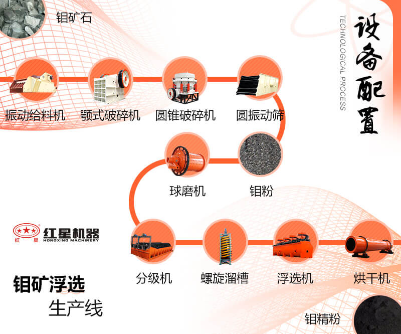 開采而來的天然鉬礦首先要經(jīng)過鄂式破碎機(jī)的粗碎,進(jìn)行初步的破碎,隨后將符合粒度要求的鉬礦物料經(jīng)圓錐破碎機(jī)進(jìn)行再次的細(xì)碎,合格的物料經(jīng)提升機(jī)送至料倉(cāng)等待研磨。由給料裝置將物料送入球磨機(jī)進(jìn)行研磨,隨后將研磨后的鉬礦細(xì)料送入螺旋分級(jí)機(jī)進(jìn)行洗凈和分級(jí),隨后經(jīng)由攪拌桶送至浮選機(jī)進(jìn)行浮選作業(yè),浮選作業(yè)主要將所需礦物與其他礦物分離開,最后通過高產(chǎn)濃縮機(jī)將礦物中的水分去除,就得到了生產(chǎn)所需的鉬礦原料。