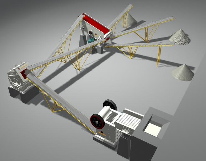 石子破碎生產(chǎn)線的生產(chǎn)流程大致為:(料倉)->振動給料機->鄂式破碎機->反擊式破碎機->振動篩->(成品石料),各設(shè)備中間以溜槽或皮帶輸送機相連。