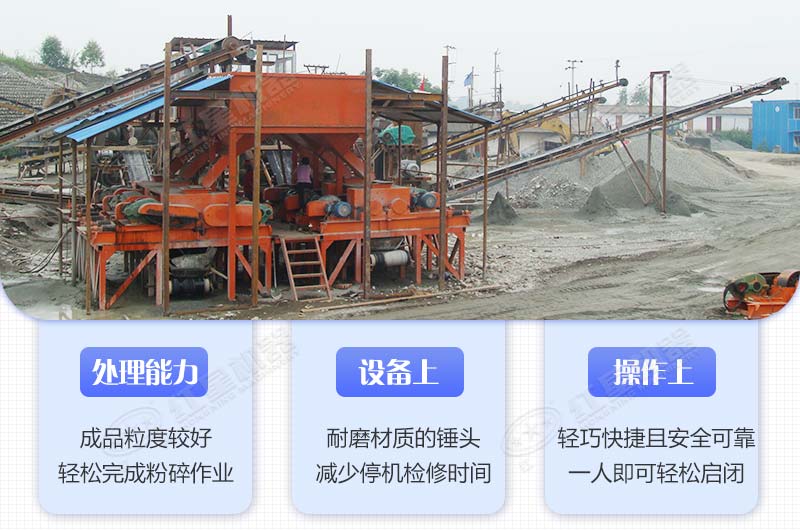 2、從設(shè)備耐磨性方面來說,雙級(jí)破碎機(jī)選用的是高合金耐磨材質(zhì)打造的錘頭,一副可頂三副使用,可大大減少停機(jī)檢修時(shí)間。